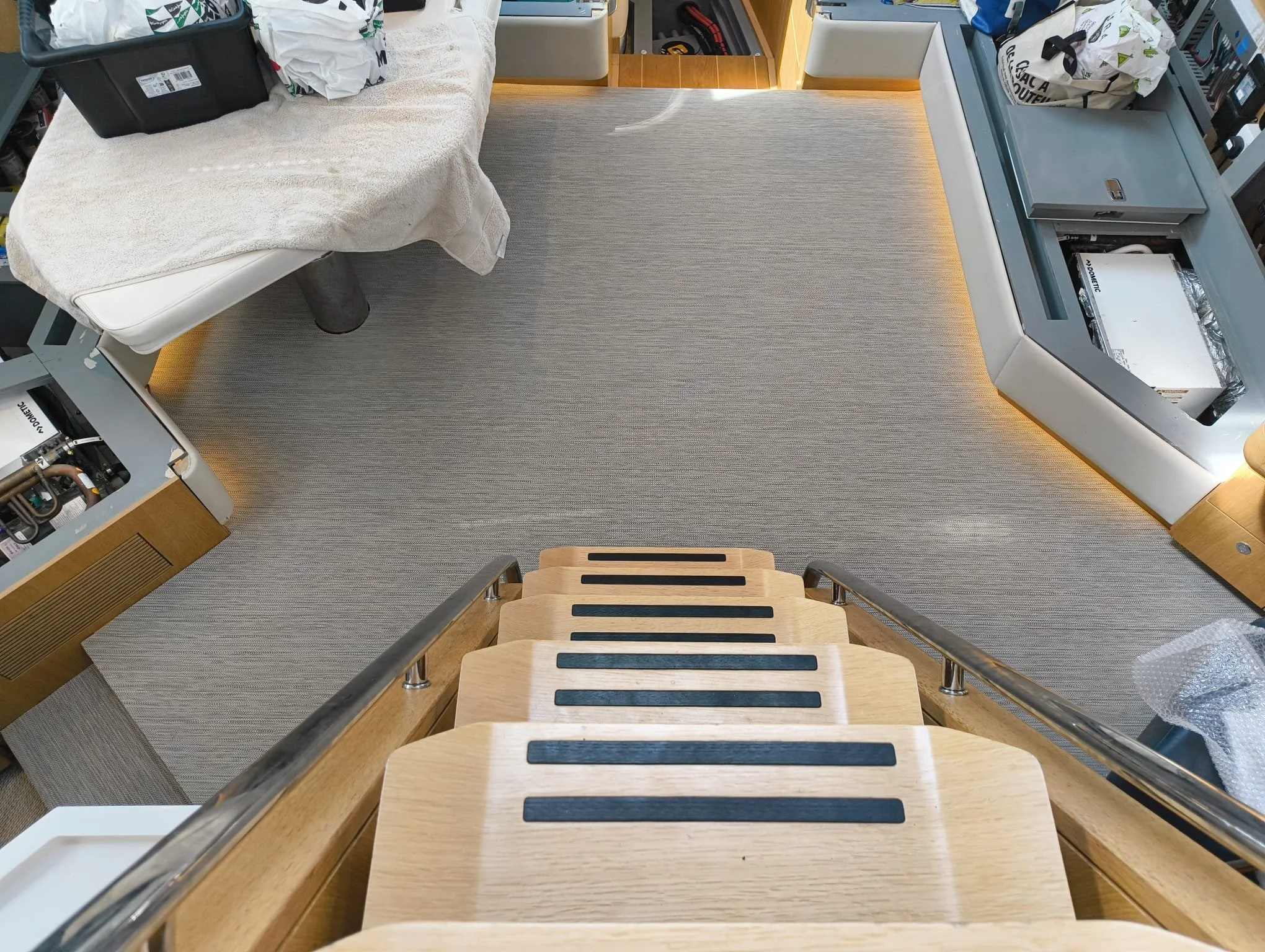 We design and craft custom-made yacht runners, available in high-resistance PVC or premium anti-slip fabrics. Their purpose is to protect onboard floors and carpets while providing safety, durability, and an elegant finish that blends seamlessly with the interior design